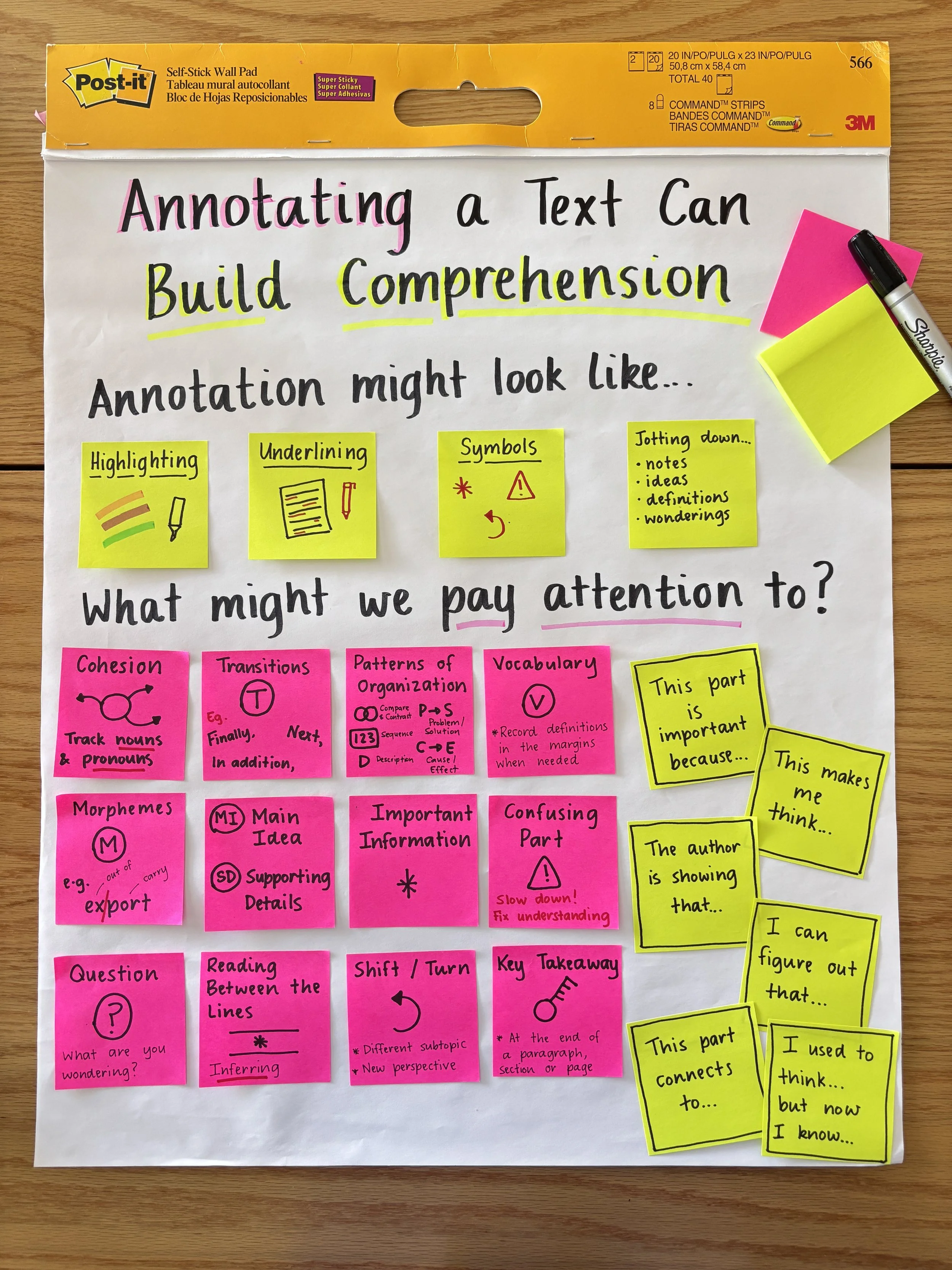 I developed this anchor chart and student reference tool (download your own free copy by clicking the link below!) specifically to support students as they unpack and annotate more challenging reading material. It provides symbols and prompts to help students pay attention to specific ways that texts can become complex (e.g. by noticing cohesion, identifying structure, breaking down vocabulary, applying morphemic awareness, and inferring meaning). These annotation prompts guide students toward the deeper work of comprehension: not just marking the page, but processing ideas.
